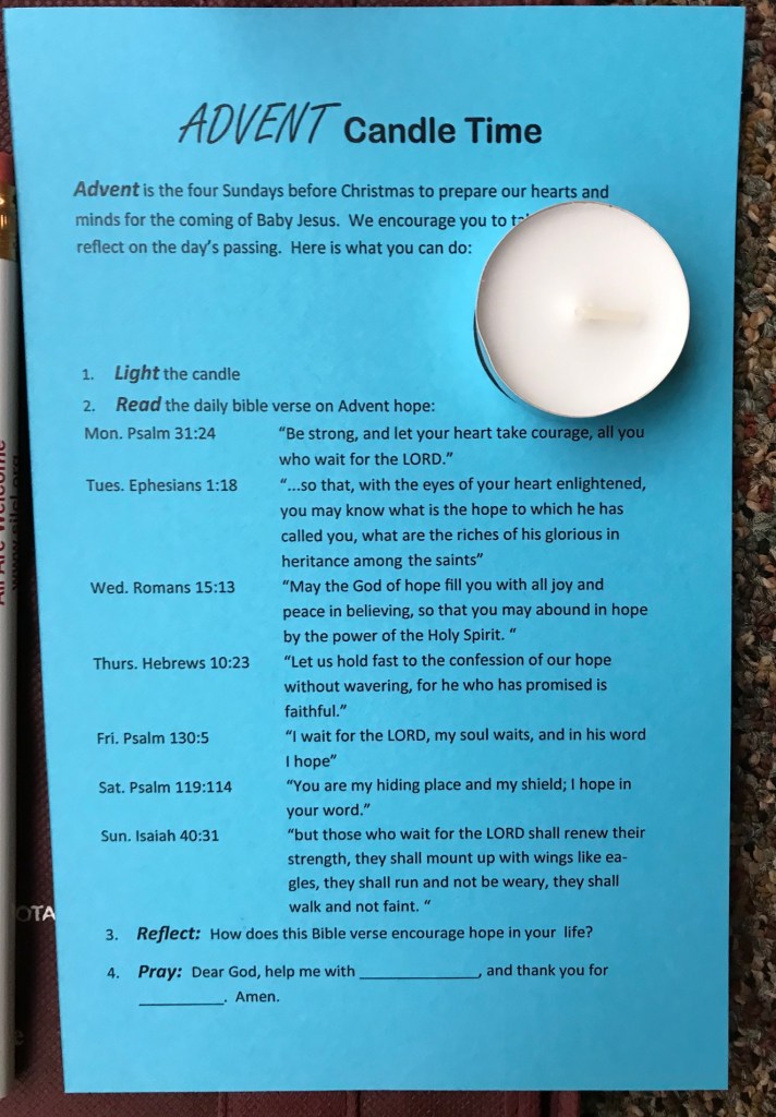 Light a Candle for Hope: Hold a drive thru Advent Sunday, and give each car a candle and devotional mat. Encourage them to light the candle each evening for hope in the world! Here is the Advent Candle Time devotional mat: