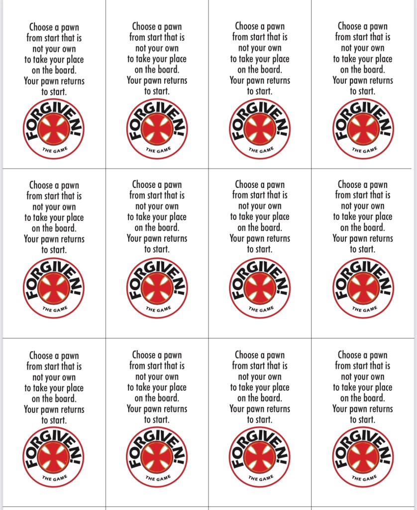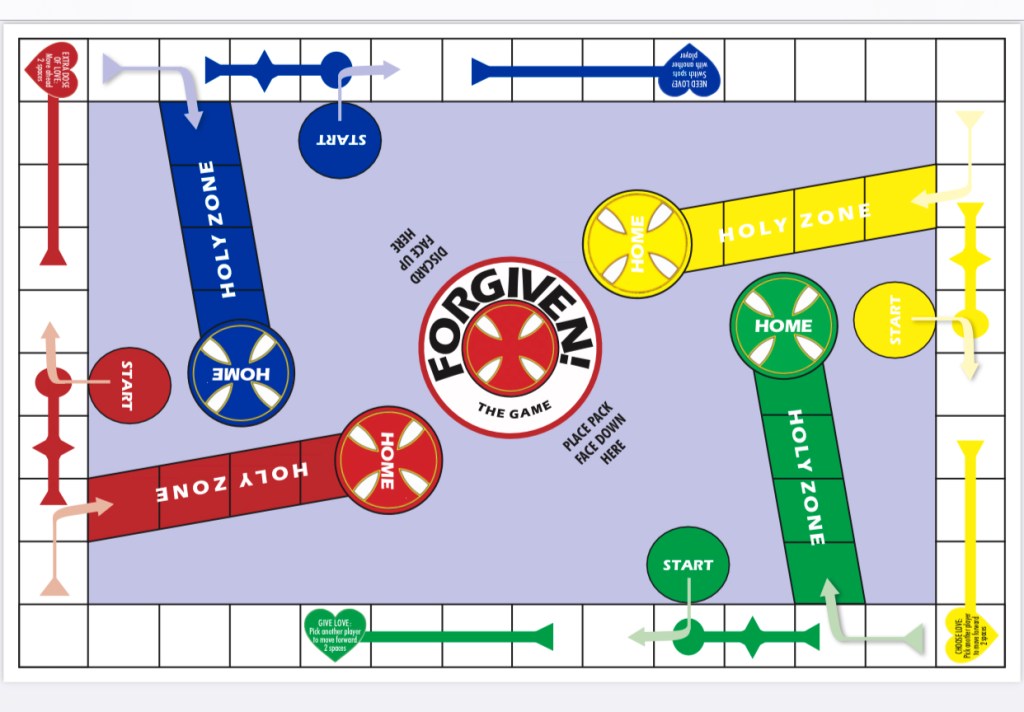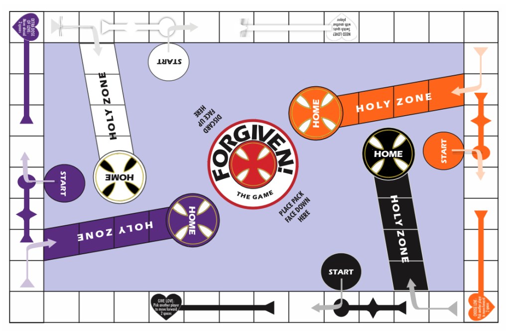 Instructions and Explanations: Forgiven is a Sorry-Parchisi-ish type game. The object of the game is to get all 4 pawns from start, through the holy zone, and home. Somewhere along the way, a player might have to be forgiven!