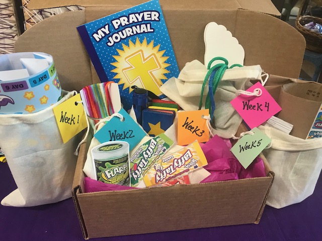 The boxes are kiddos age 3 to 2nd grade, and there are three boxes available Old Testament Stories, Advent & Christmas, and Lent & Easter. Each box contains enough supplies for one kid, and each box costs $25 (which covers supplies and shipping in the continental USA).