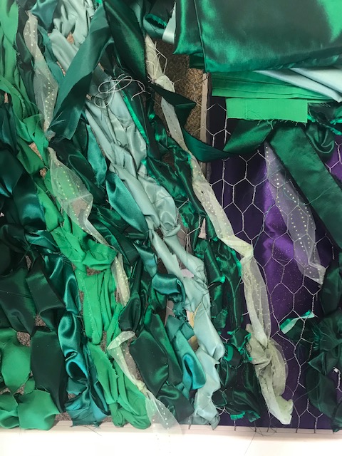All you need is some chicken wire and build a frame around it. Our frames are 4′ by 4′ and the chicken wire is framed on both sides. We used strips of fabric to make the pasture scene. The sheep are attached to the chicken wire with Christmas ornament hooks. The sheep are wooden cutouts (something like these), and the kids and adults created their own sheep. We did it as a part of worship.