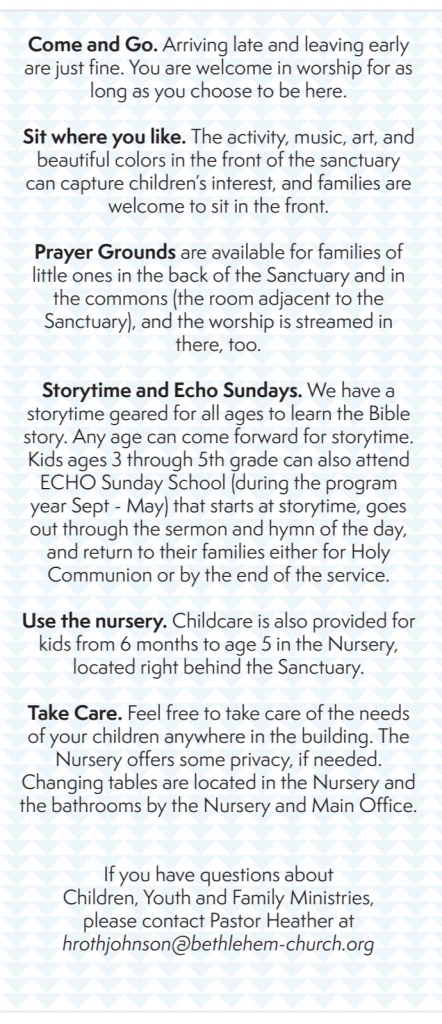 As Family Pastor at Bethlehem Lutheran Church – Twin Cities, I am always cultivating new programming or revising it. We have traditions like 3rd Grade Bibles or First Communion classes, but I also like to try new things to see what works. We are a multisite church, and ministry does not look the same at each campus. And, that’s just fine! The reason I put this post together is that I get quite a few inquiries on what I am doing for families, or Sunday School, or baby ministry, so I thought I would list it all here or you can check it out on this page: